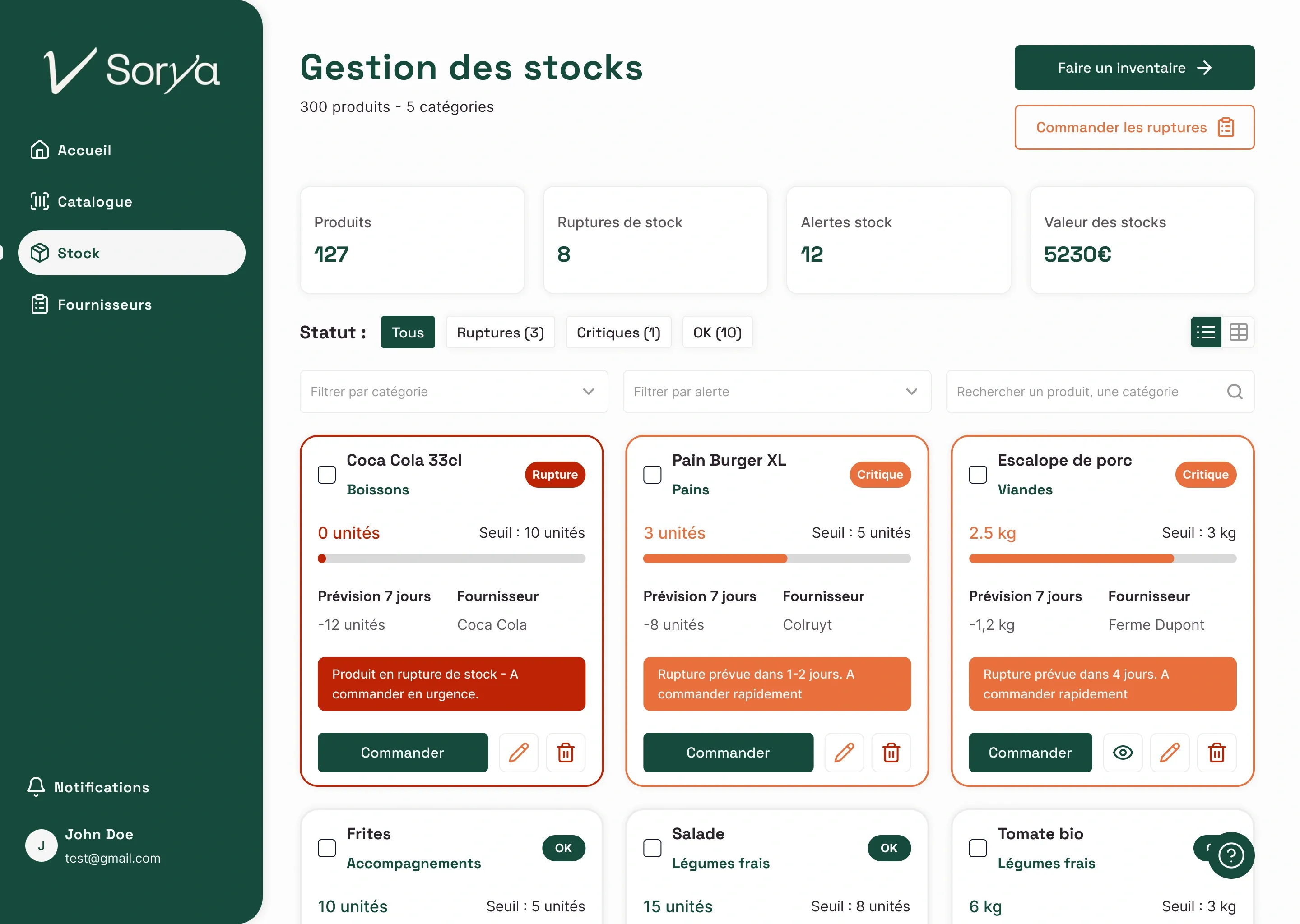 Sorya prédit automatiquement vos besoins, génère vos commandes et vous fait gagner 3h par semaine. Testé et approuvé par des restaurateurs comme vous.