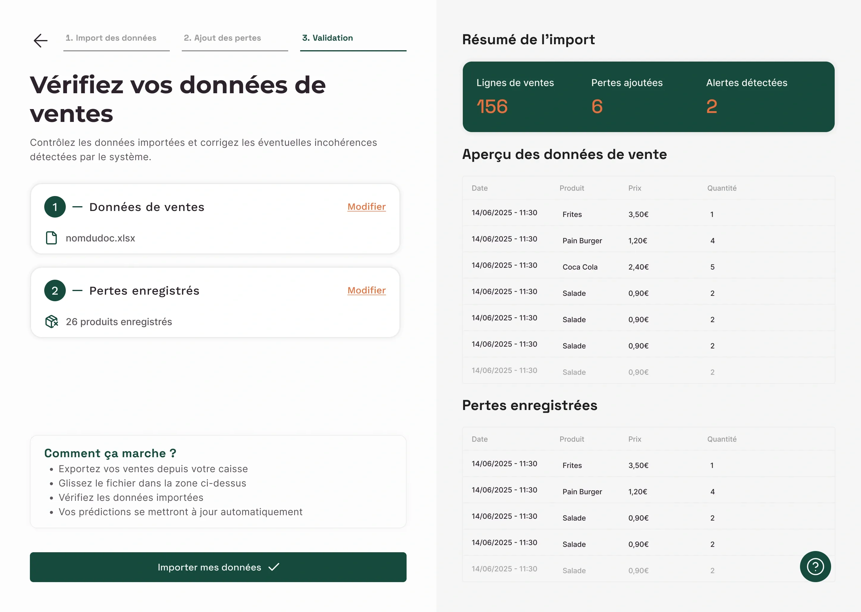 Sorya accepte tous les formats (Excel, CSV) et détecte automatiquement vos produits. Pas de système de caisse moderne ? Notre modèle pré-rempli fait le job en 5 minutes.